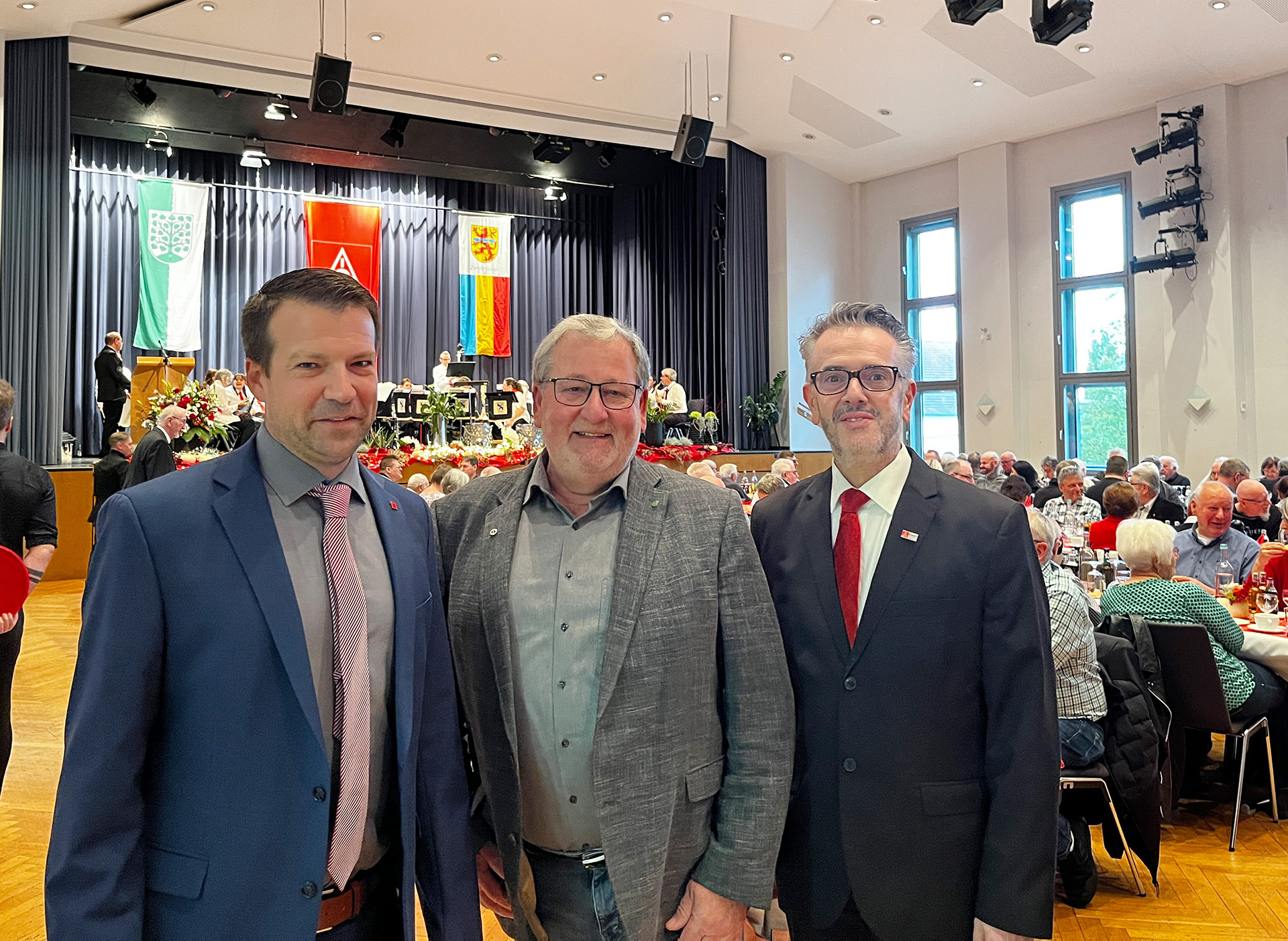 Bürgermeister Manfred Rippel (Mitte) mit den Bevollmächtigten der IG Metall Homburg-Saarpfalz, Peter Vollmar (l.) und Salvatore Vicari (r.) im gut gefüllten Saalbau.
