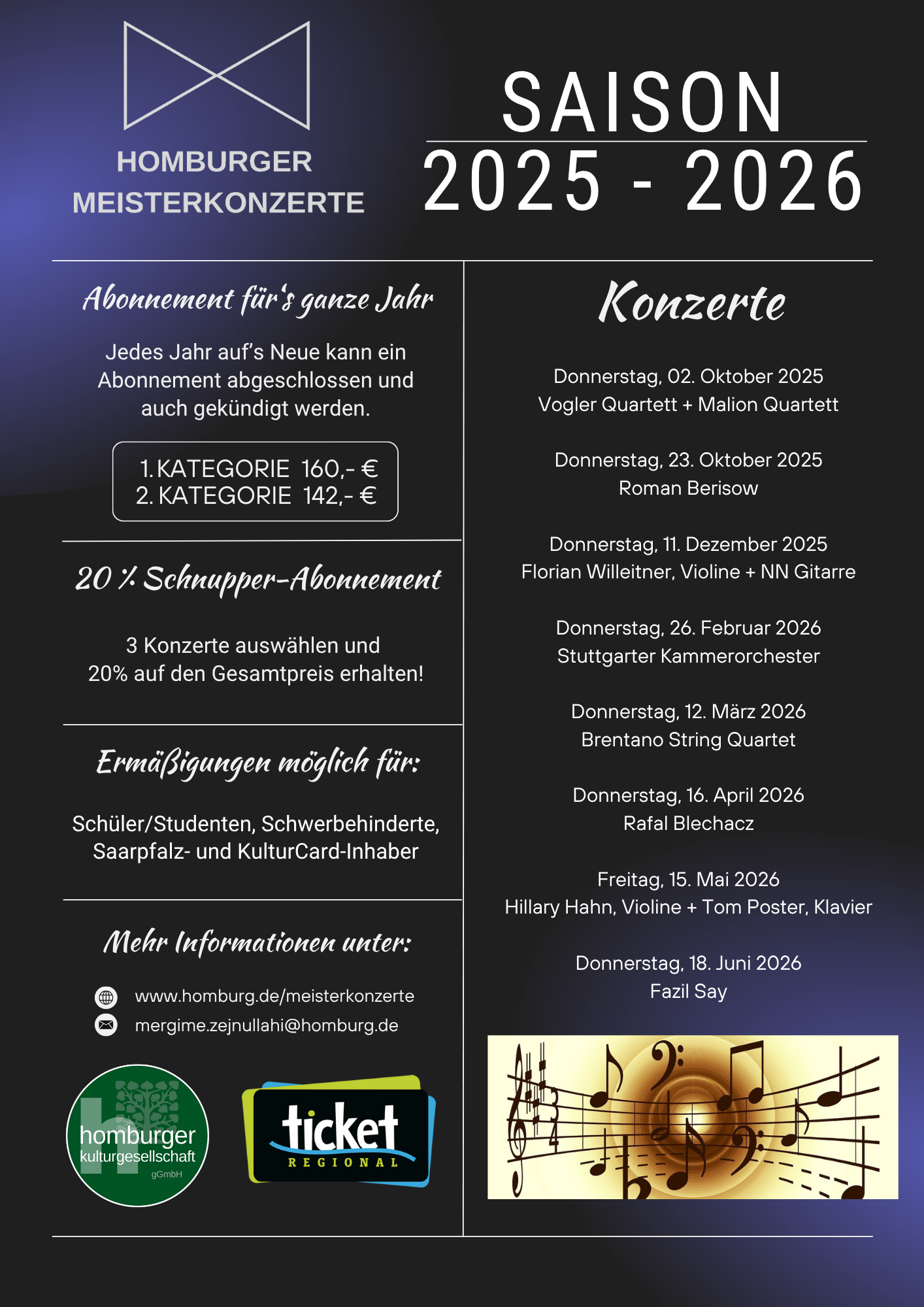 Tolle Künstler, große Bühne, klangliche Vielfalt – die Meisterkonzert-Saison der Kreis- und Universitätsstadt Homburg richtet sich an alle Liebhaber klassischer Musik und darüber hinaus. In jeder Spielzeit erwartet Sie eine feinsinnige Auswahl aus internationalen Klassik-Stars und aufstrebenden Talenten, die auch mutig neue Wege erkunden. Künstlerischer Leiter der Reihe ist Markus Korselt (externer Link zur Homepage des Kulturmanagers und Dirigenten). Die Meisterkonzerte finden im Kulturzentrum Saalbau statt. Über die Saison hinweg stehen in insgesamt acht Konzerten ausgewählte Solisten, Kammerensembles und Orchester auf der Bühne. Ob traditionelles Repertoire oder überraschende Genre-Grenzgänge: Hier wird Musik auf höchstem Niveau erlebt.