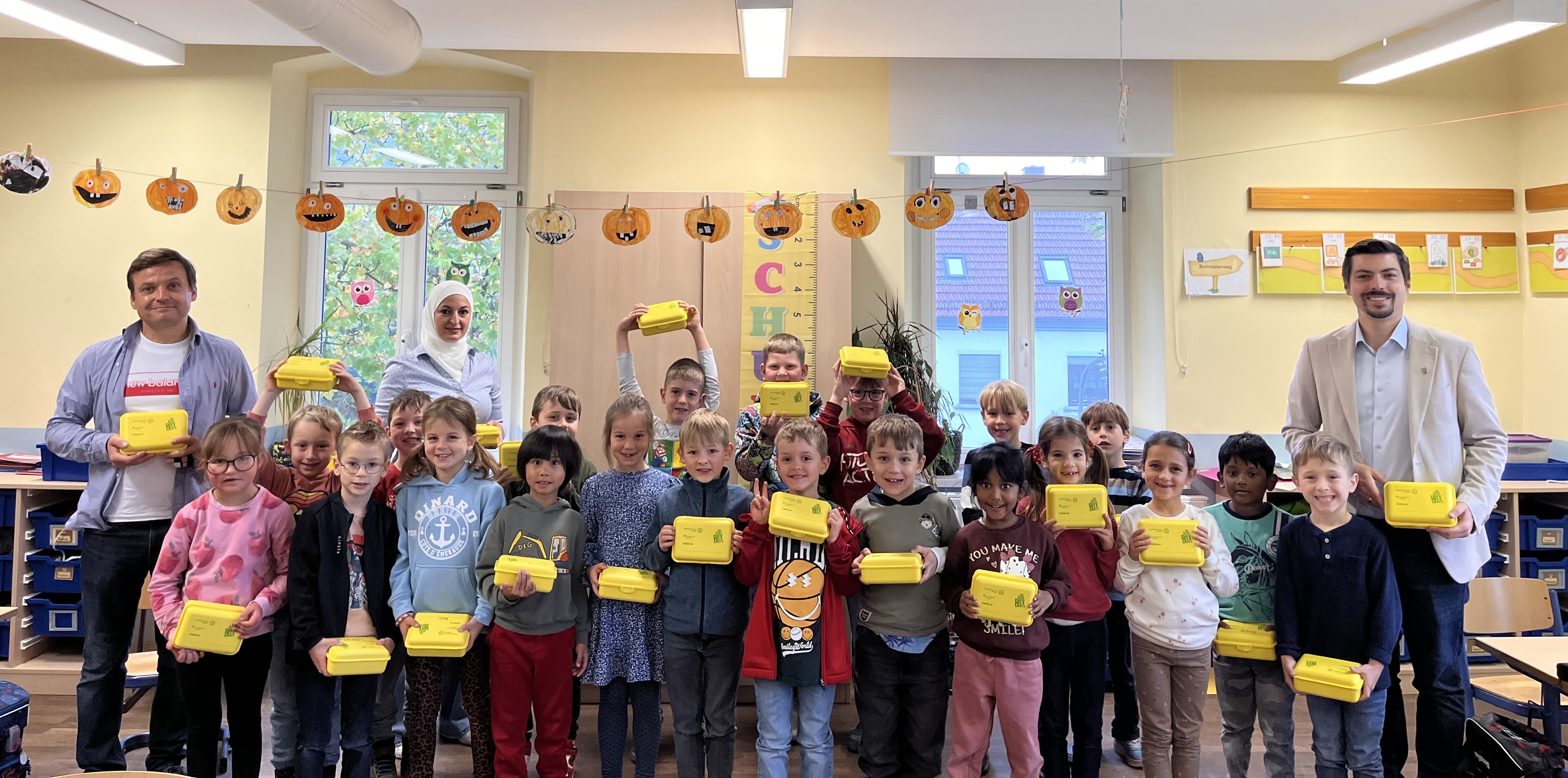 Auch in diesem Herbst erhielten die Erstklässlerinnen und Erstklässler der Homburger Grundschulen wieder eine besondere Überraschung: Im Rahmen der 16. Bliesgau-Bio-Brotbox-Aktion bekamen sie eine gelbe Brotbox, gefüllt mit leckeren, gesunden und regionalen Produkten.