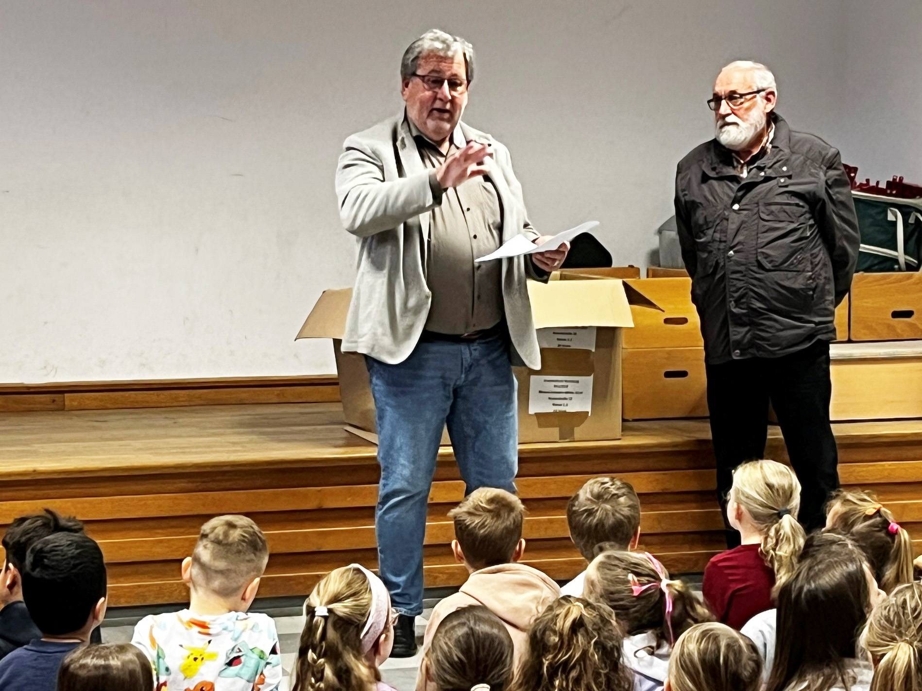 Bürgermeister Manfred Rippel (vorne l.) las in der Grundschule Bruchhof den Erstklässlerinnen und Erstklässlern die unterhaltsame Geschichte „Vom knackigsten Gemüse der Welt“ vor. Foto: Linda Barth