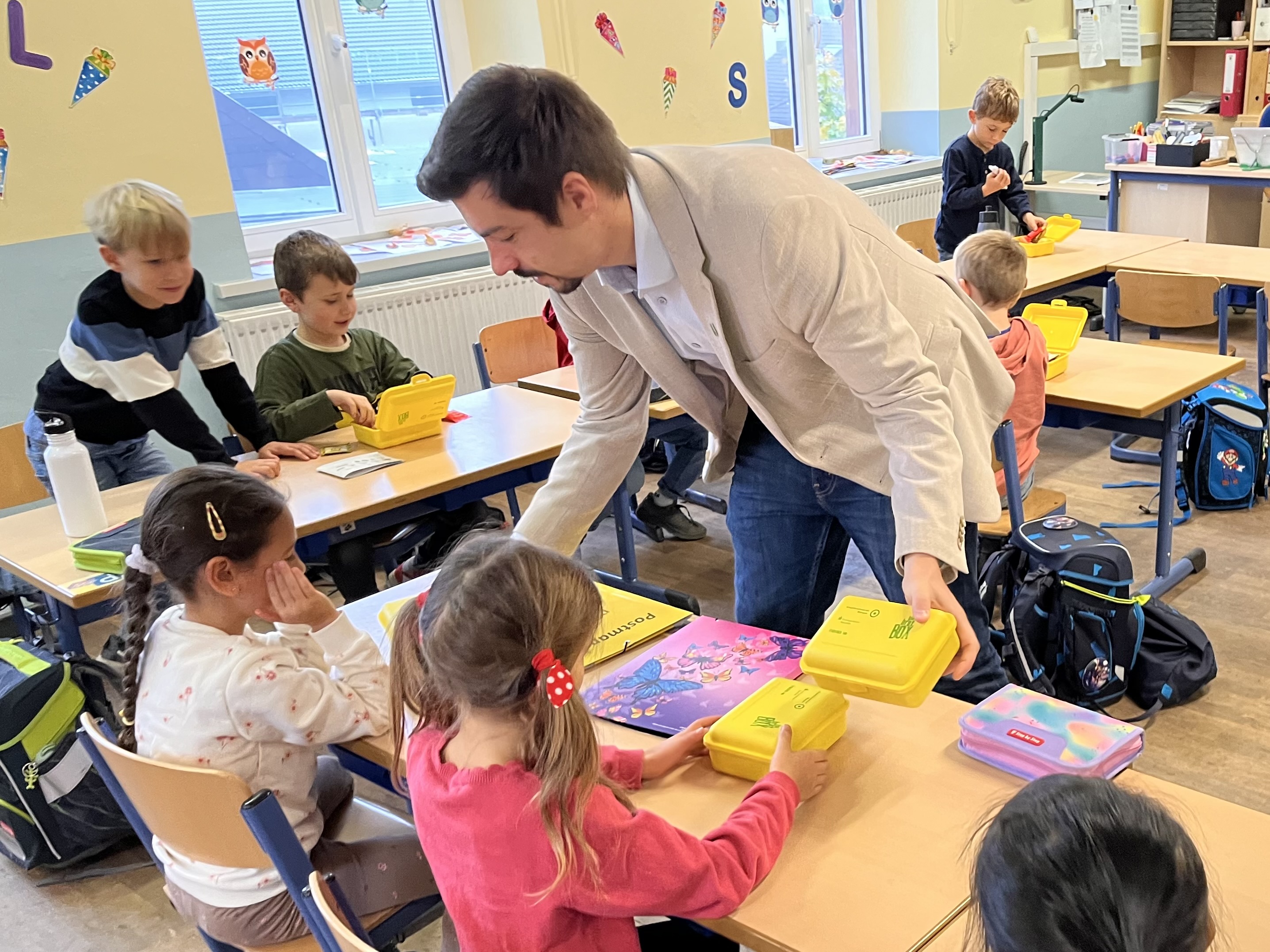 Der hauptamtliche Beigeordnete Philipp Scheidweiler verteilte die gelben Bio-Brotboxen an die Erstklässlerinnen und Erstklässler der Grundschule Beeden. Die Kinder freuten sich über die gesunde Stärkung und die regionalen Leckereien in ihren Boxen. Foto: Julie Jager