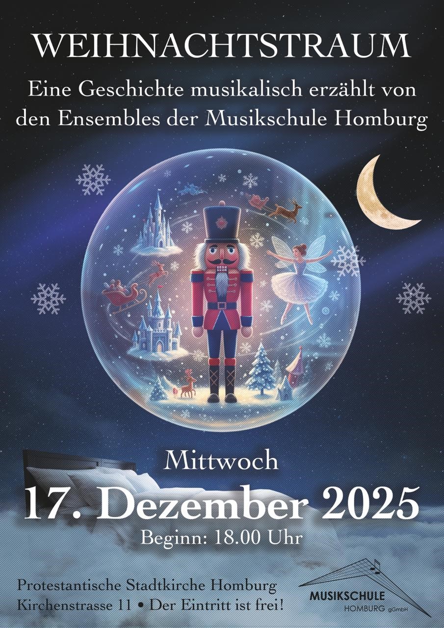 Unter dem Titel „Weihnachtstraum – Eine Geschichte musikalisch erzählt von den Ensembles der Musikschule“ erwartet die Besucherinnen und Besucher ein stimmungsvolles Programm, das den Traum des Nussknackers zum Leben erweckt.