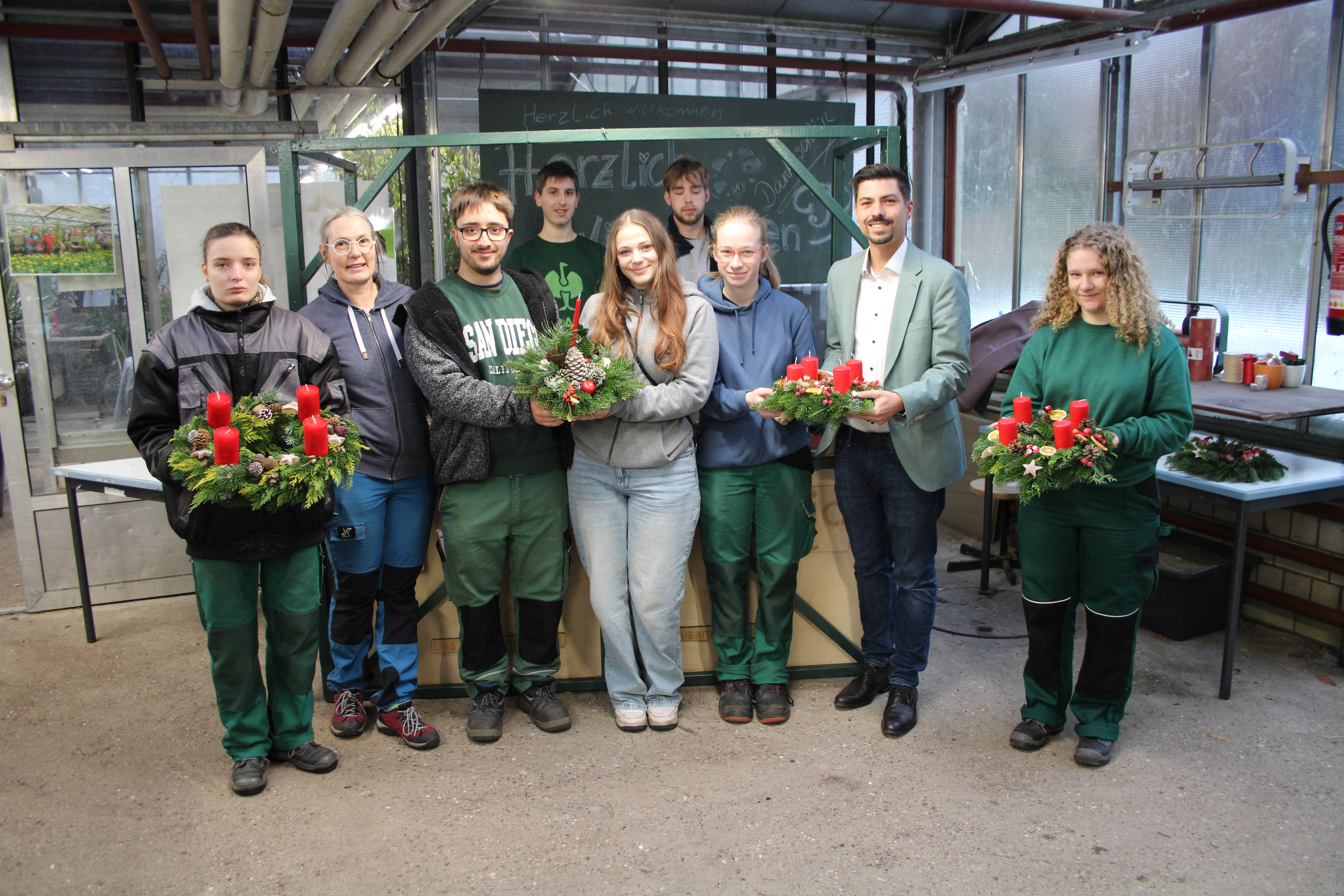 Der Beigeordnete Philipp Scheidweiler (2. v. r.) nahm in der Gärtnerei des CJD drei Adventskränze entgegen und bedankte sich bei der Gelegenheit auch für die schöne Kooperation des Berufsbildungswerks mit dem Römermuseum. Auf dem Bild stehen die Auszubildende Tim und Florian (hinten v. l.) sowie Sophie, Ausbilderin Margret Metzger, Philip, Lydia, Caroline (v. l.) und Isabelle (ganz rechts).