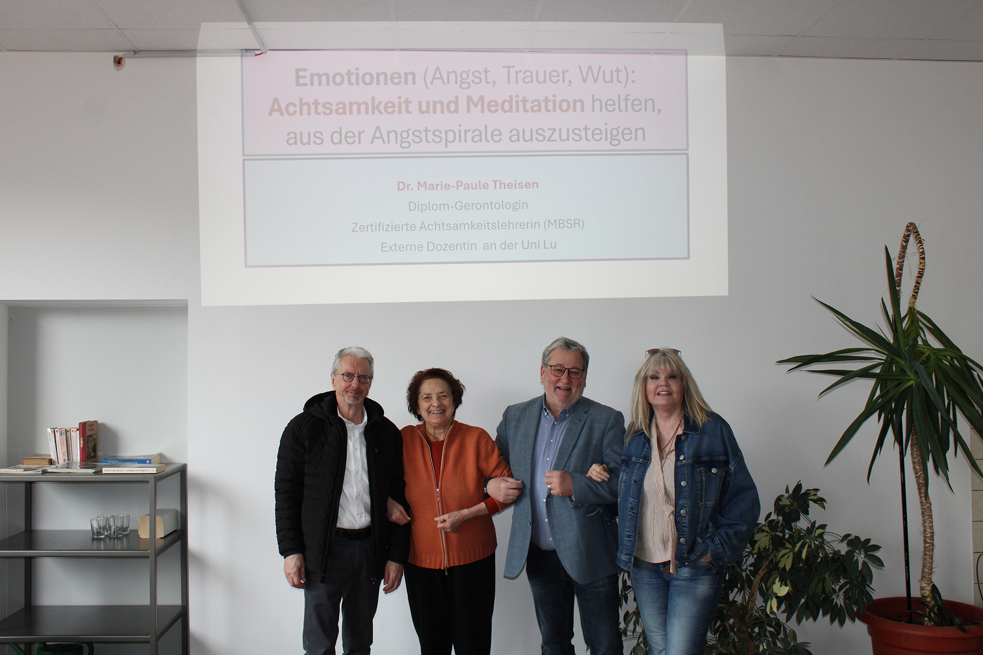 Wilfried Bohn (AfÄ), Dr. Marie-Paule Theisen, Bürgermeister Manfred Rippel und Patricia Hans (AfÄ) vor Beginn des Workshops zur Achtsamkeit im Kursraum der Akademie für Ältere.