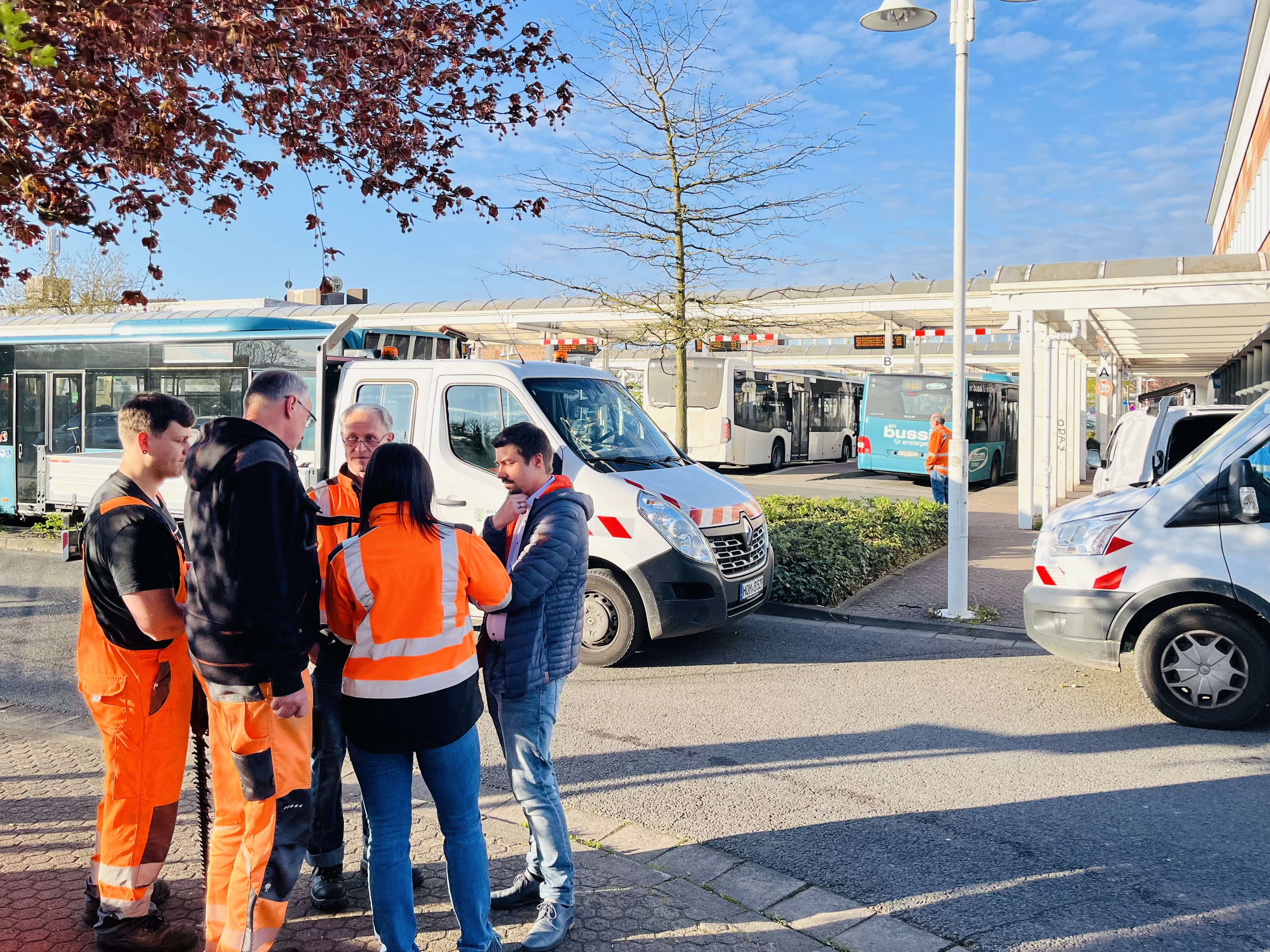 Der Beigeordnete Philipp Scheidweiler (3. v. l.) und Silke Fuchs von der Deutschen Bahn (4. v. l.) gemeinsam mit Mitarbeitern des Baubetriebshofs (BBH) vor Ort am Homburger Hauptbahnhof.