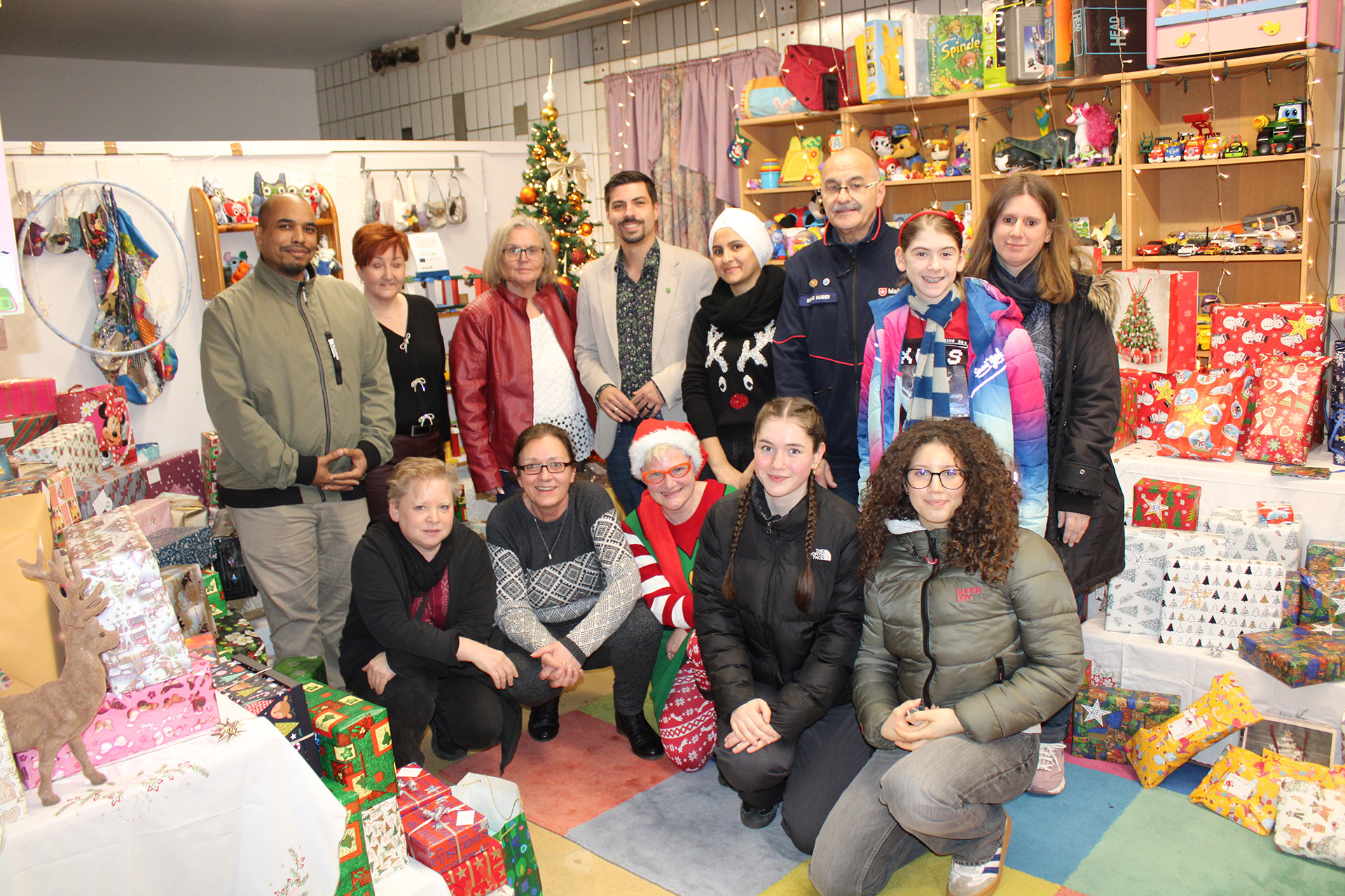 Im Geschenkezimmer der Kleiderkammer versammelten sich vor der Verteilung der Geschenke u. a.: Marc James Brown und Anja Lange sowie Anette Weidler und der Beigeordnete Philipp Scheidweiler (hinten . v. l.) sowie Simone Lukas, Bettina Dejon und petra Haag (unten v. l.) mit Helferinnen der Kleiderkammer, der Malteser sowie Schülerinnen des Saarpfalz-Gymnasiums.