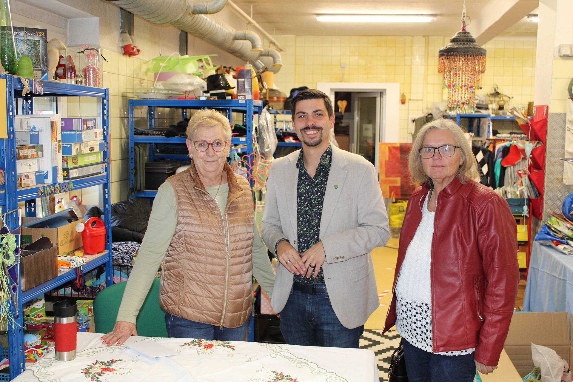 Ein kleines Präsent und ein besonderes Dankeschön richtete der Beigeordnete Philipp Scheidweiler bei dem Besuch in der Kleiderkammer an Petra Schossow, die schon seit längerer Zeit regelmäßig ehrenamtlich in der Kleiderkammer im Einsatz ist und auch an diesem Tag bei der Geschenkeverteilung half.