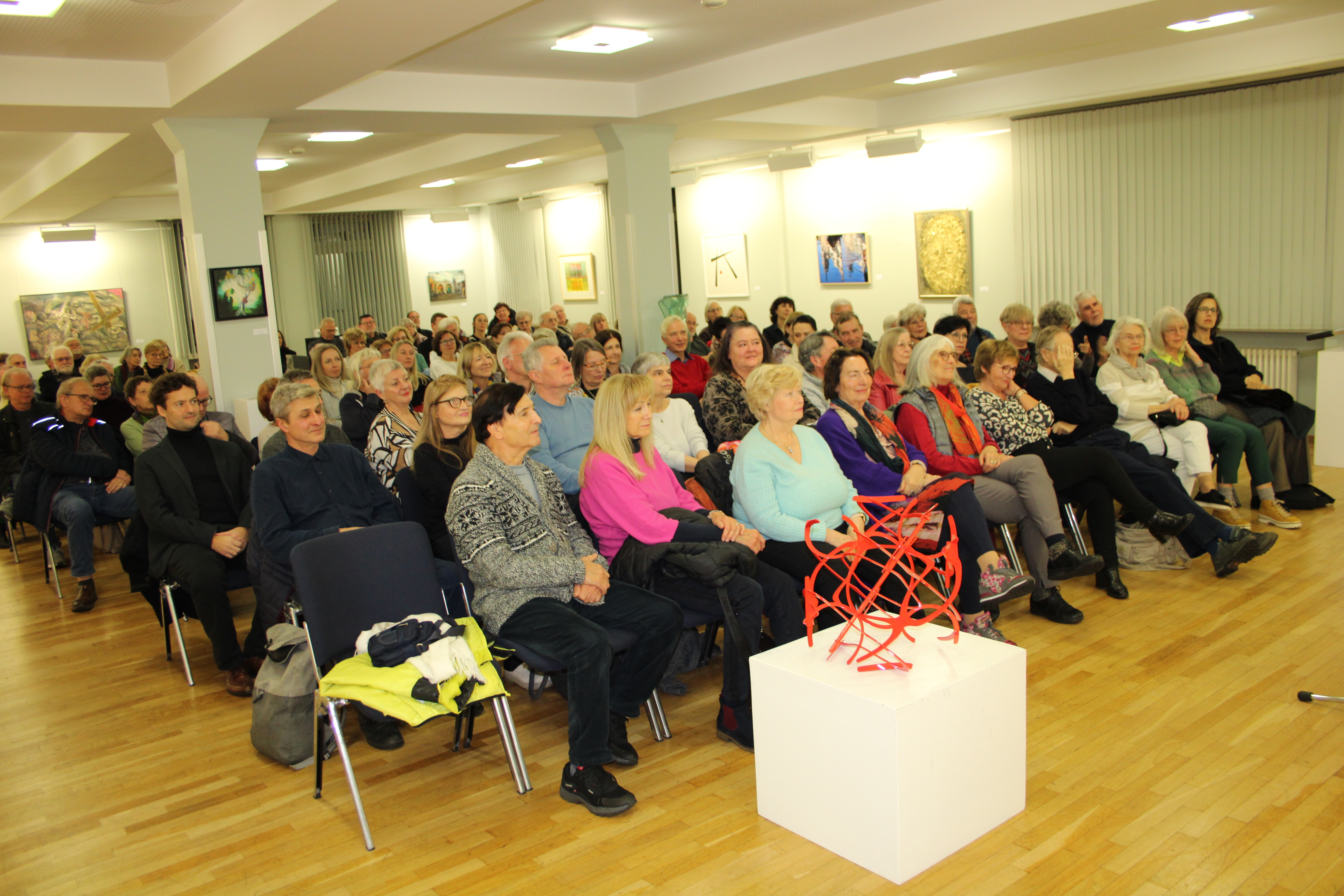 Dann ging die Kuratorin auf alle ausgestellten Arbeiten informativ und interpretierend näher ein und sagte, dass die Jahresausstellung facettenreich die Augen der Besucherinnen und Besucher öffnen könnte. Dazu stellte sie noch die Frage: „Leben wir in ver-rückten Zeiten oder in einer Zeit mit Ver-rückten?“ Zum Abschluss zitierte sie Erasmus von Rotterdam mit den Worten: „Ein Leben mit einem gewissen Grad an Verrücktheit ist die höchste Form des Glücks.“