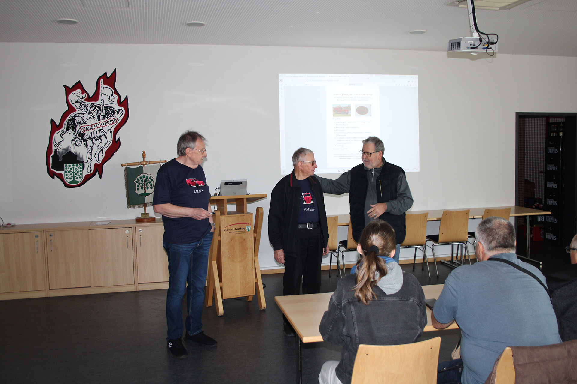 Im Mittelpunkt der Jubiläumsfeier stand die festlich geschmückte „Emma“, die 1955 als Tanklöschfahrzeug zur Feuerwehr nach Homburg gekommen war. Nach einer ersten Begrüßung lud Bürgermeister Rippel alle Interessierten zunächst in den Schulungsraum der Feuerwehr, ein. Dort dankte er nochmals allen Beteiligten für ihren Einsatz und den Gästen für ihren Besuch.