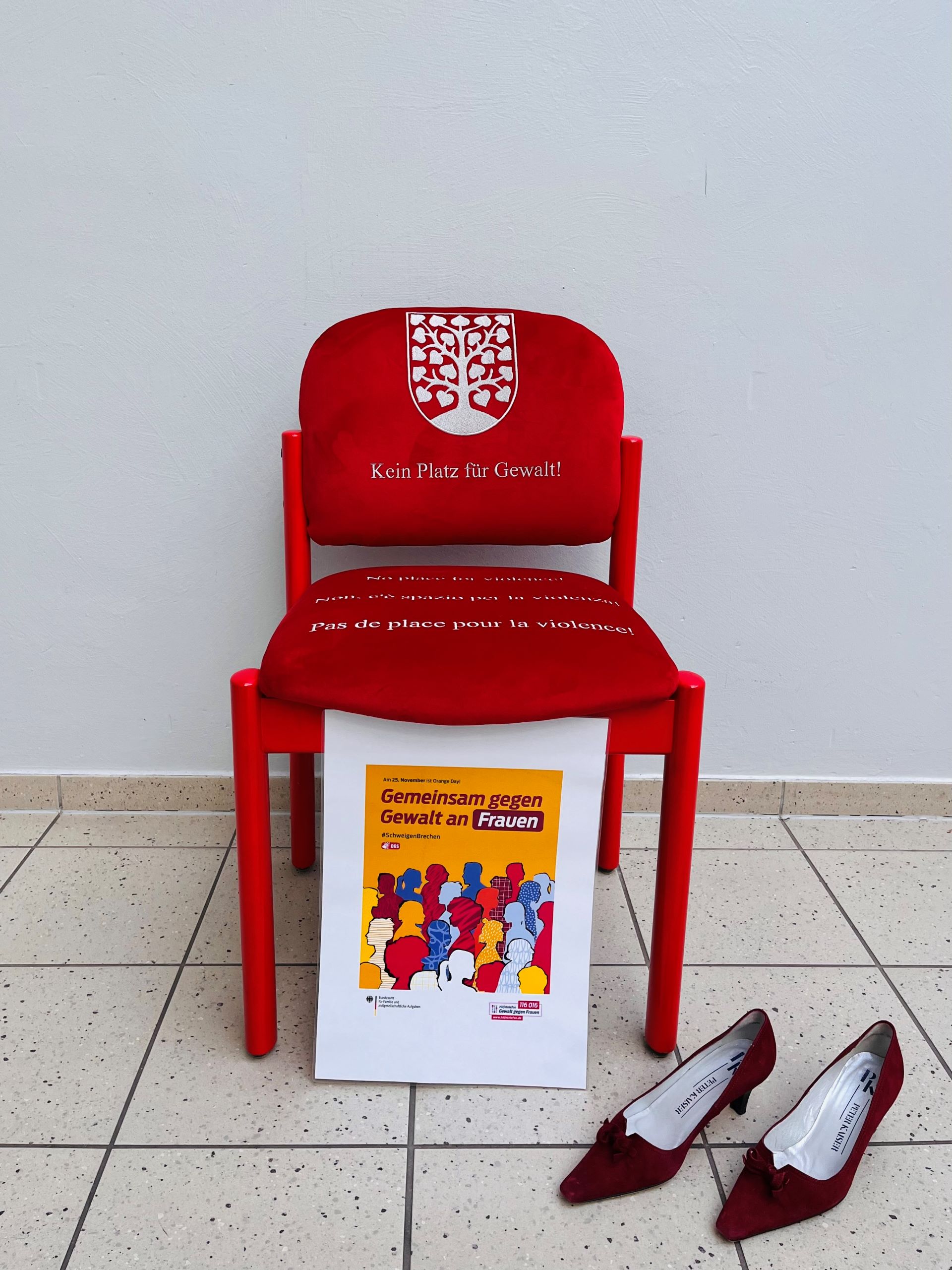 Der rot lackierte und mit rotem Stoff bezogene Stuhl trägt die Inschrift „Kein Platz für Gewalt!“ in mehreren Sprachen. Die Mehrsprachigkeit der Inschrift weist daraufhin, dass Gewalt ein weltweites Problem ist. Thomas Sterl (Sterl Design) sponsorte zudem einen zweiten Stuhl. Philipp Scheidweiler bedankte sich besonders bei Anke Michalsky, Barbara Emser, Petra Simon, Astrid Di Franco und Marion Wagner, bei Jochen Maas und Thomas Sterl sowie Christine Maurer, der Vorsitzenden des Arbeitskreises „Gewalt gegen Frauen“.
