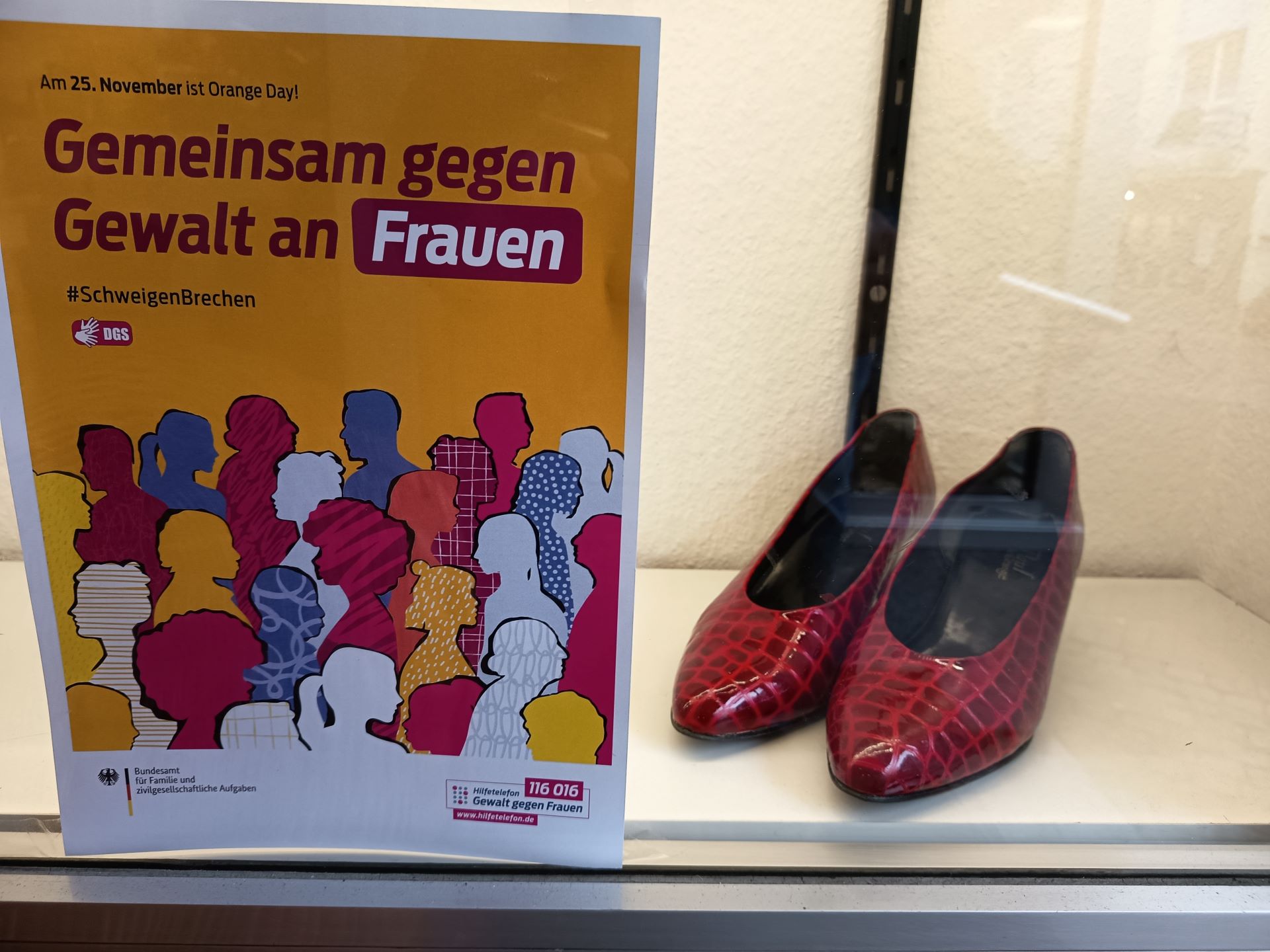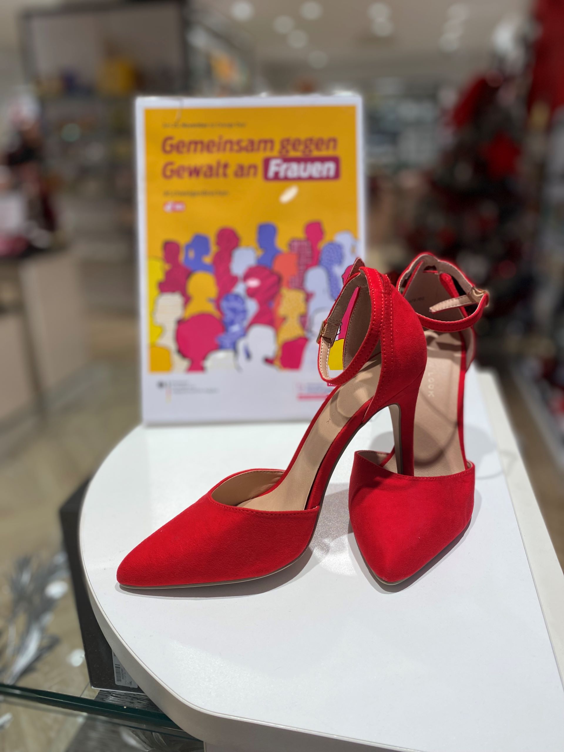 Besonders bedankte sich die Frauenbeauftragte bei Jochen Maas und bei Thomas Sterl für den zweiten, gesponserten Stuhl. „Damit erweitern wir den Aktionsradius und erreichen eine größtmögliche Öffentlichkeit“, betonte sie. Durch den Kontakt zum Gewerbeverein sowie durch Gespräche mit mehreren Einzelhandelsgeschäften und Cafés hätten sich erfreulicherweise einige der Aktion angeschlossen und stellen als Zeichen der Solidarität rote Schuhe in ihren Schaufenstern aus. Diese wurden größtenteils von der Kleiderkammer zur Verfügung gestellt. Auch könne der zweite rote Stuhl an verschiedenen Stellen eingesetzt und genutzt werden, erklärte Anke Michalsky. Bereits am Dienstagabend wurde er spontan bei einer größeren Kulturveranstaltung im Saalbau verwendet.