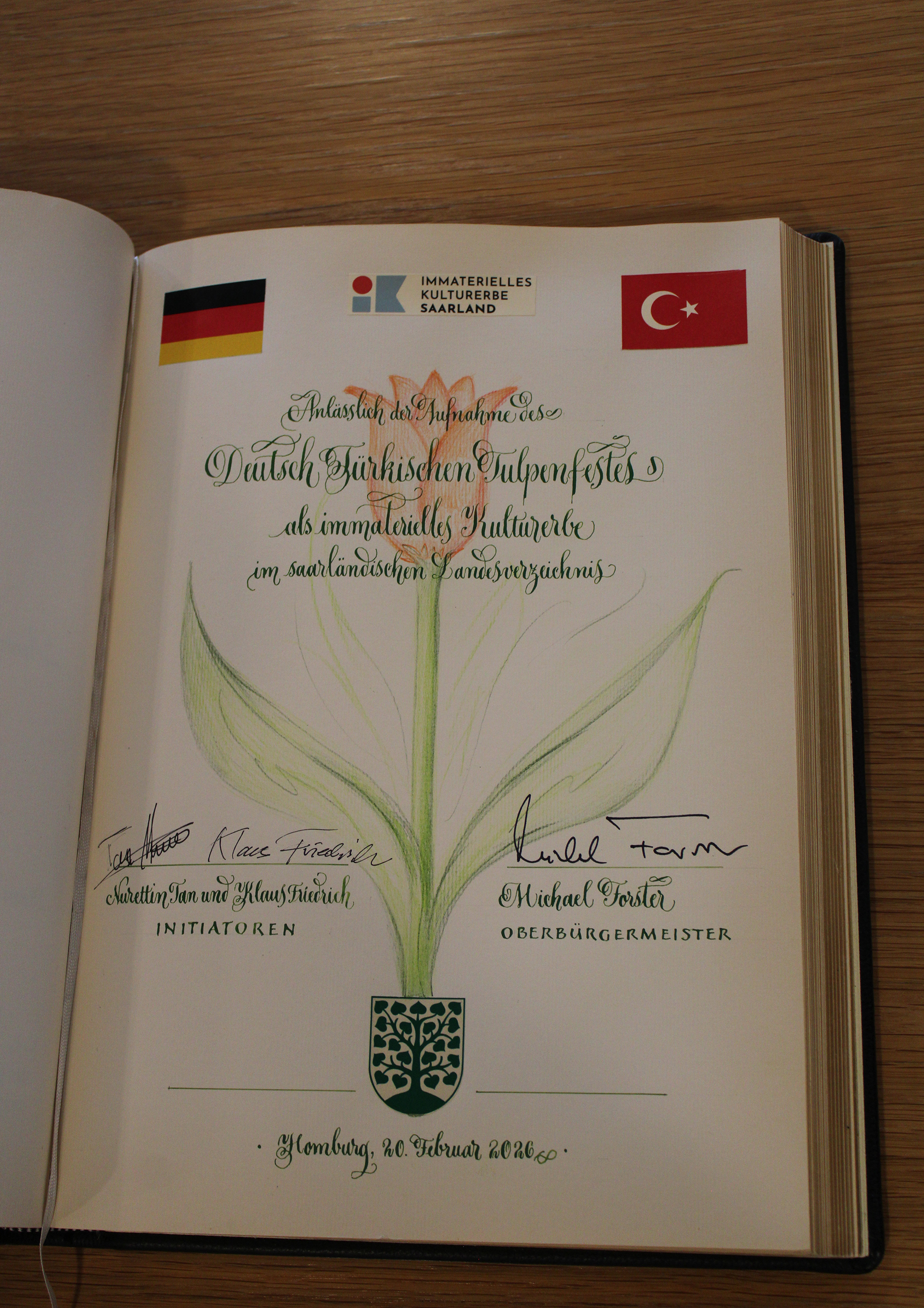 Nachdem das deutsch-türkische Tulpenfest in Homburg durch die offizielle Aufnahme in das saarländische Landesverzeichnis des Immateriellen Kulturerbes eine hohe Auszeichnung erfahren hat, hat Oberbürgermeister Michael Forster die beiden Hauptorganisatoren dieses Festes zu einer besonderen Würdigung ins Rathaus eingeladen. So haben sich Nurettin Tan und Klaus Friedrich kürzlich in das Goldene Buch der Stadt Homburg eingetragen.