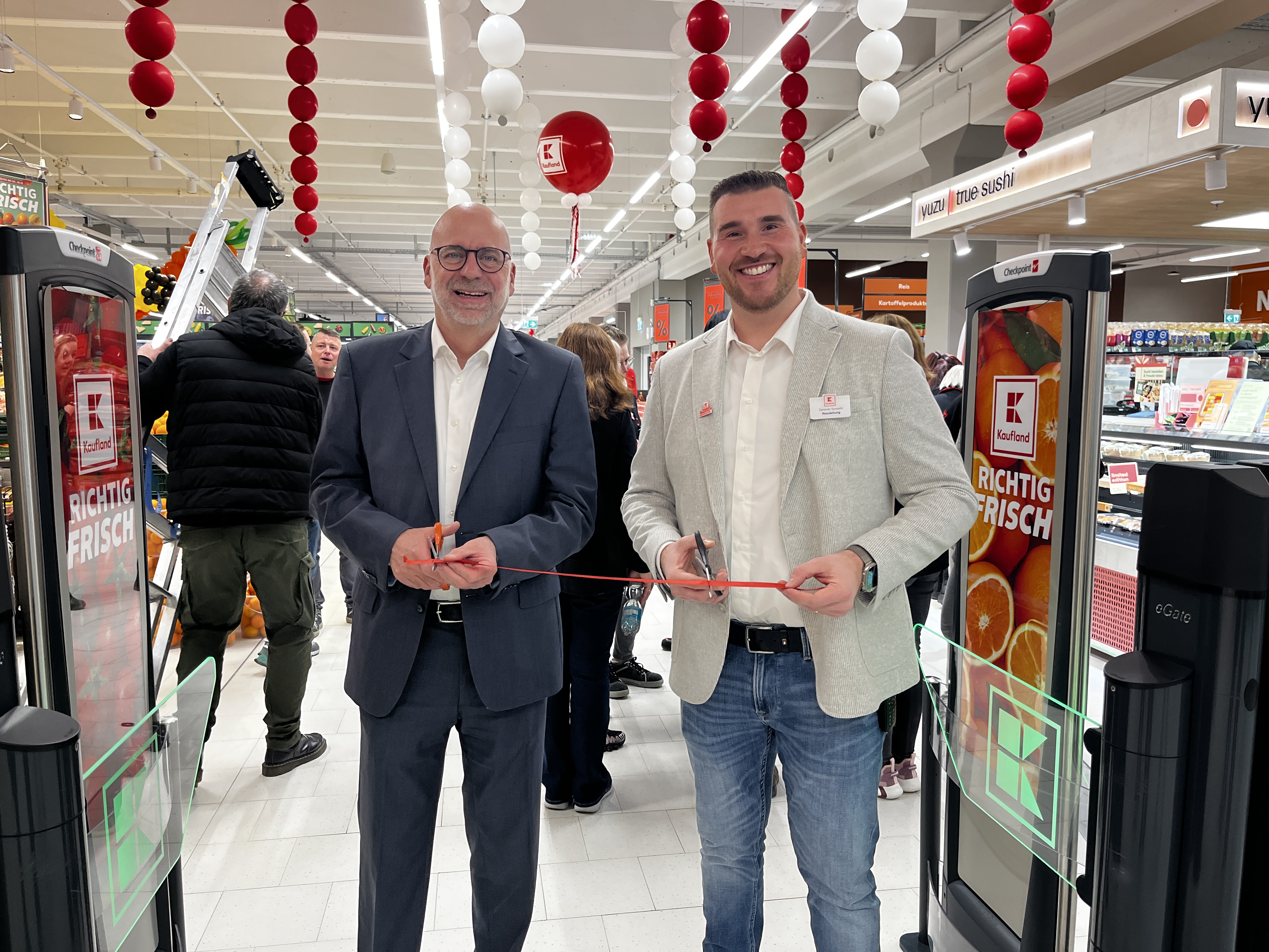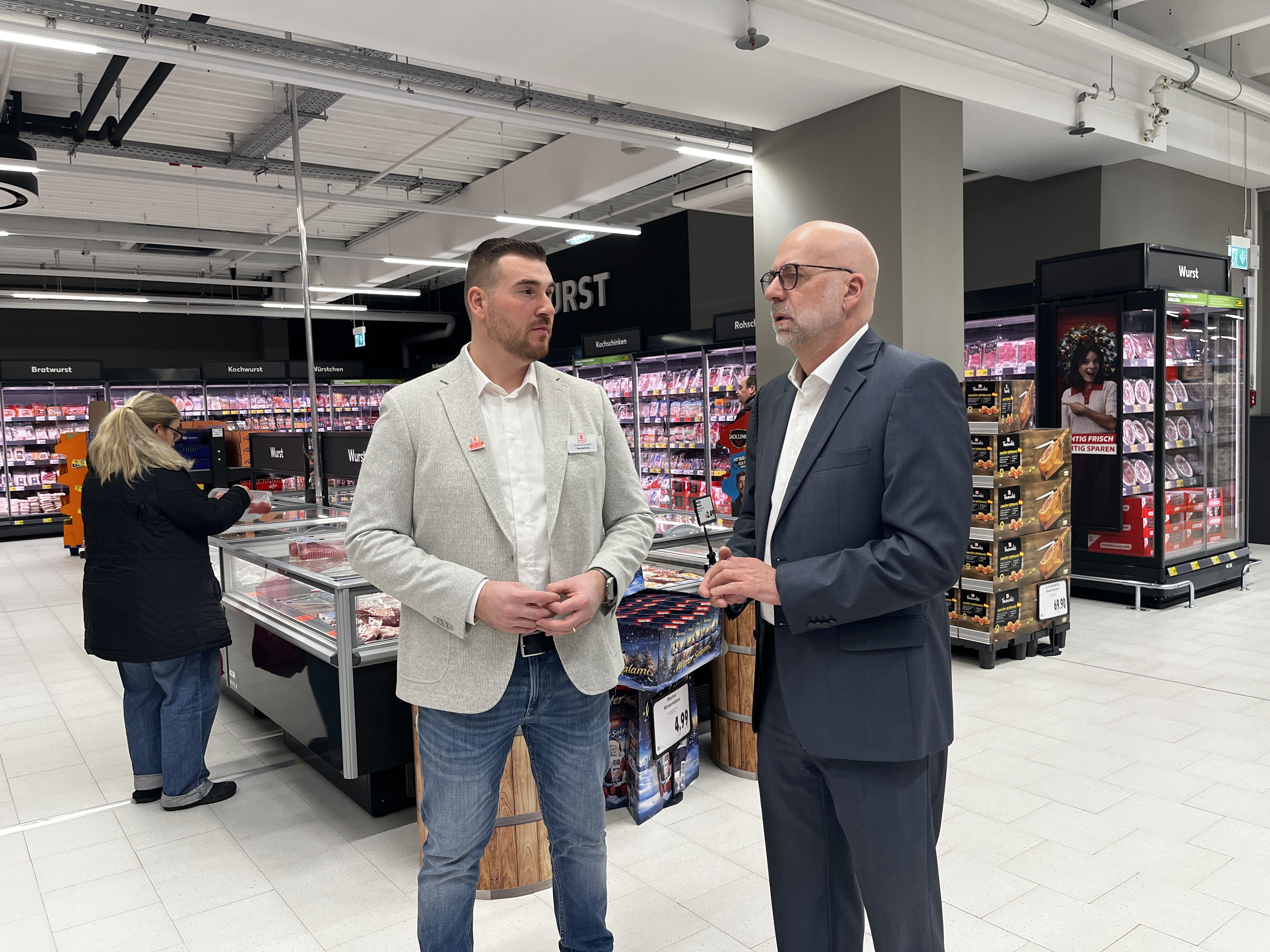 Schon am frühen Morgen war die Motivation der 113 Mitarbeitenden spürbar – die meisten von ihnen gehören bereits seit Jahren zur Belegschaft. „Man hat heute richtig gemerkt, wie groß die Freude ist, endlich wieder loslegen zu können“, so der OB, was auch Filialleiter Scarpello bestätigte und vor allem die „Mannschaftsleistung“, insbesondere in den intensiven Tagen vor der Eröffnung, lobte. Beim Rundgang zeigte er dem Oberbürgermeister die modernisierte Kühltechnik, das überarbeitete Frischekonzept sowie die neuen digitalen Angebote wie SB-Kassen und K-Scan.