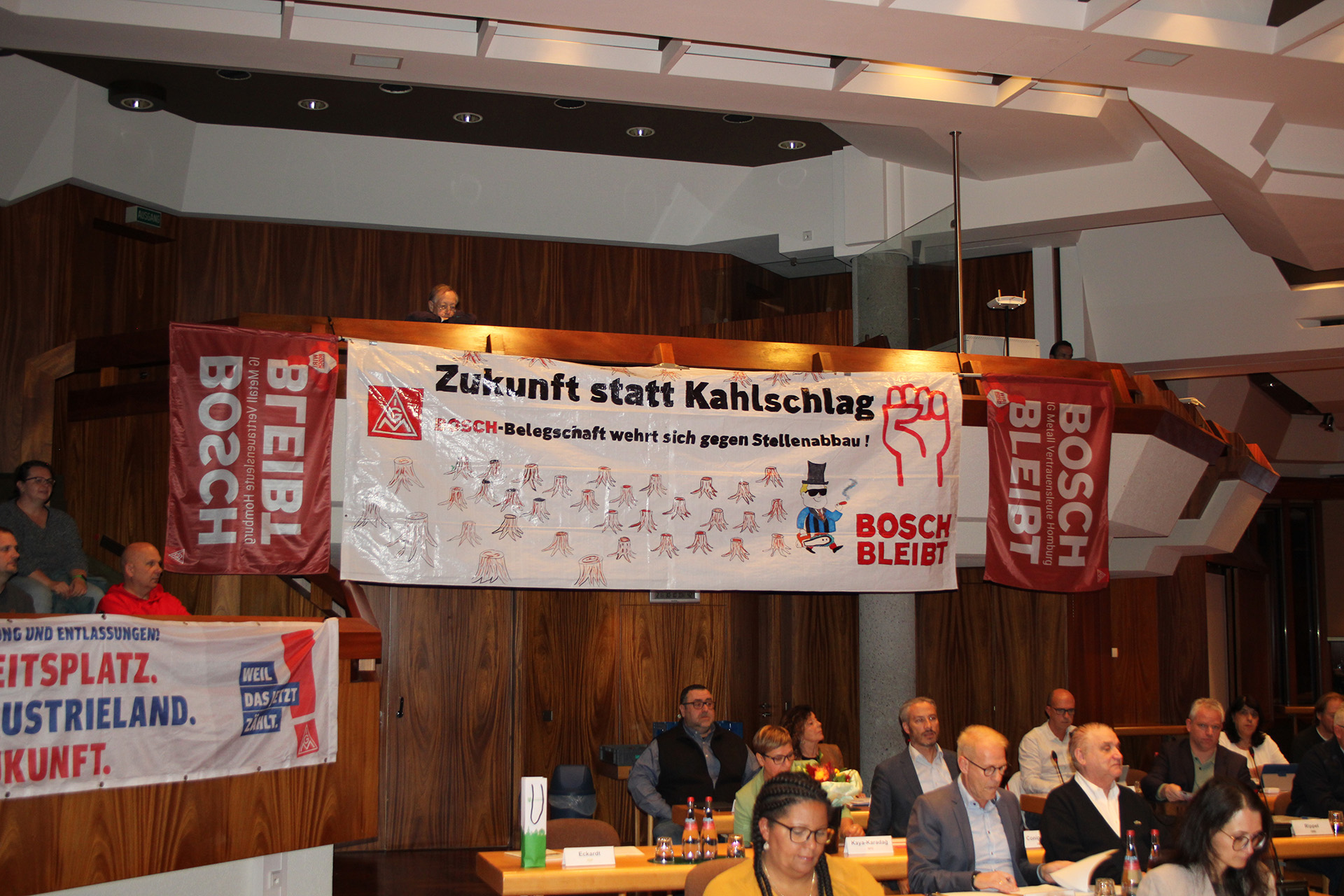 Simon wurde von rund 30 Mitarbeiterinnen und Mitarbeitern von Bosch begleitet, die an der Besuchertribüne des Sitzungssaals mehrere Transparente gegen den Stellenabbau angebracht hatten. „Wir stehen hinter Ihnen, sind für Sie da und werden Sie, soweit es in unserer Macht steht, unterstützen“, sagte OB Forster in Richtung der Bosch-Beschäftigten.