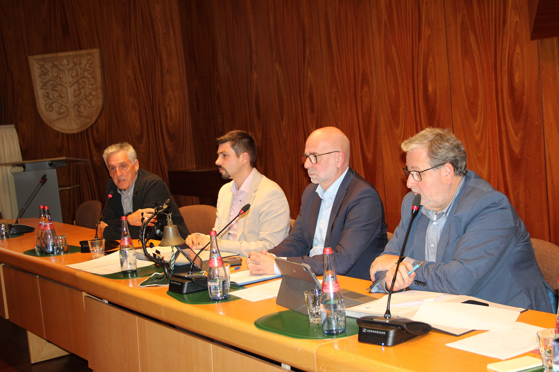 Oliver Simon berichtete im Stadtrat über den aktuellen Stellenabbau bei Bosch. Dabei nahm er neben dem Beigeordneten Philipp Scheidweiler, Oberbürgermeister Michael Forster und Bürgermeister Manfred Rippel (v. l. n. r.) Platz.