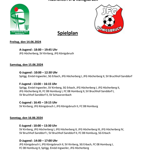 Am Sonntag, 16. Juni, geht es los mit der E-Jugend. Von 10 bis 13.30 Uhr sind folgende Mannschaften im Wettstreit vereint: SV Kirrberg, JFG Höcherberg I, JFG Höcherberg II, JFG Höcherberg III, JFG Höcherberg IV, SV Bruchhof-Sanddorf I, SV Bruchhof-Sanddorf II, FC 08 Homburg und SG Erbach.