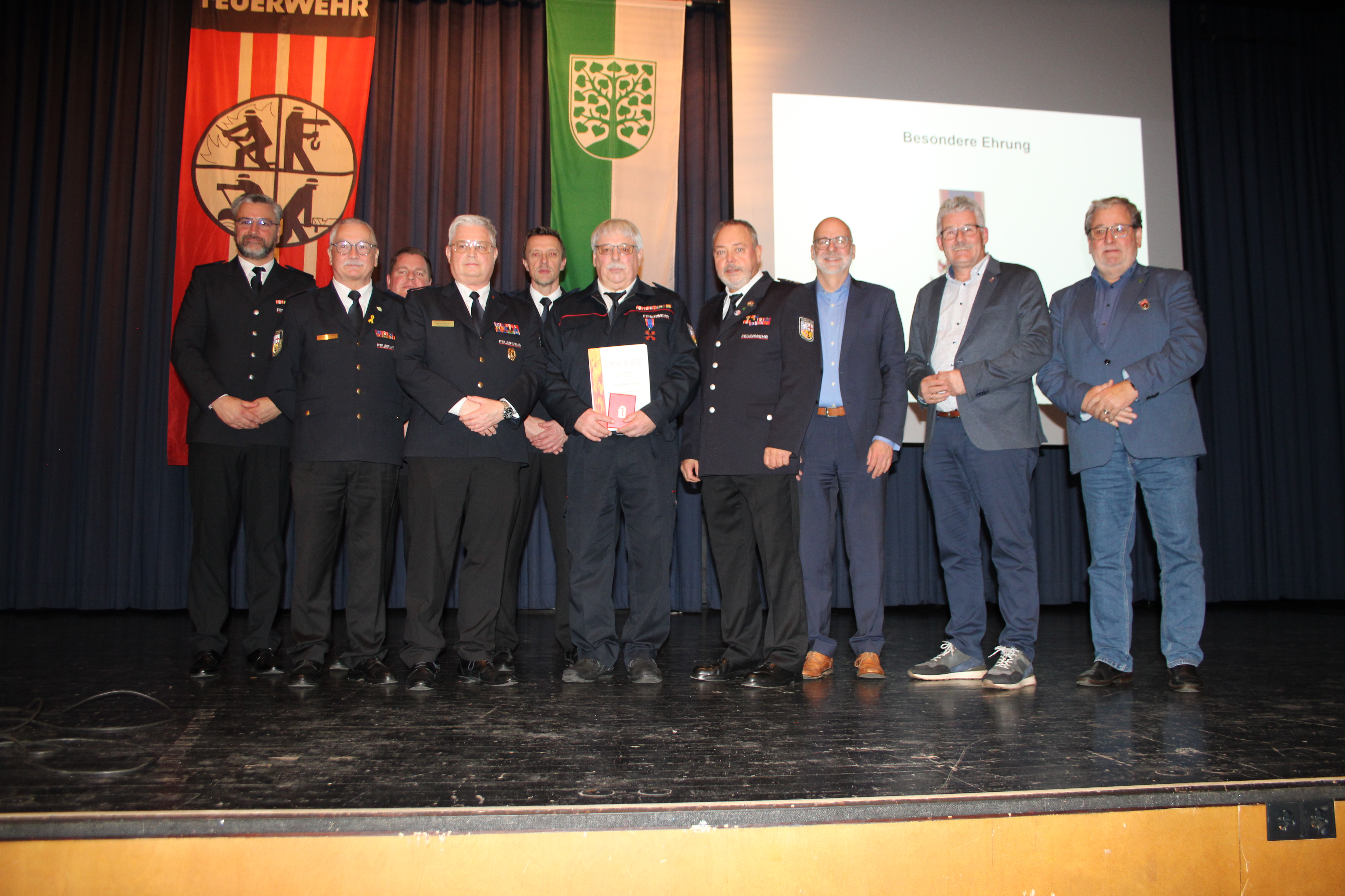Hans-Peter Schad vom Löschbezirk Homburg-Mitte wurde am Ehrungsabend zunächst nach mehr als 50 Jahren im aktiven Dienst in die Alterswehr übernommen. Zum Abschluss der Ehrungen wurde er erneut auf die Bühne gerufen und für ihn überraschend mit dem Deutschen Feuerwehr-Ehrenkreuz in Bronze des Deutschen Feuerwehrverbandes ausgezeichnet.