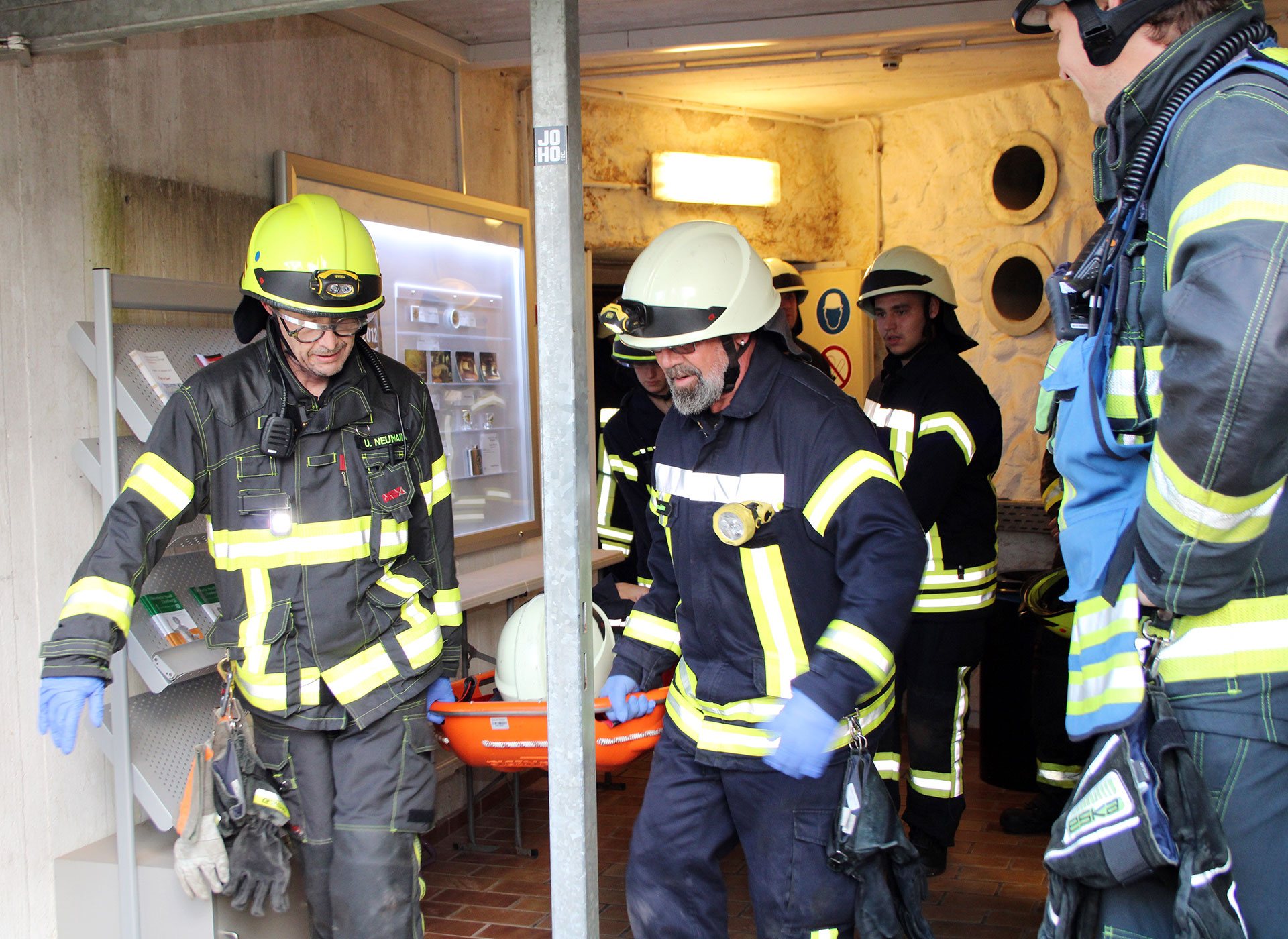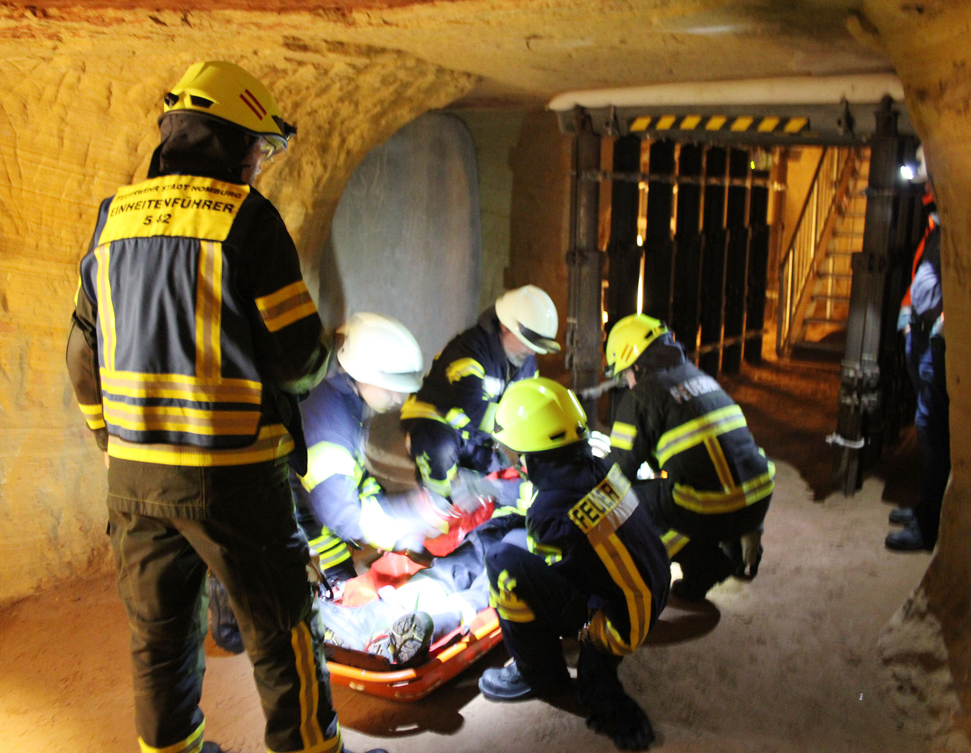 Die eintreffenden Feuerwehrleute wurden von Höhlenführer Markus Orth instruiert, wo der Verletzten zu finden sei. Unverzüglich machten sich die ersten beiden Feuerwehrmänner auf den Weg, beruhigten den Verletzten und befragten ihn nach seinem Zustand. Mit Hilfe einer Plane wurde der verletzte Mann, der starke Schmerzen hatte und seine Beine nicht bewegen konnte, von den nachgerückten Einsatzkräften in eine Schleifkorbtrage gehoben und zum Eingangsbereich getragen. Die Leitung des Einsatzes in den Höhlen hatte der stellvertretende Löschbezirksführer von Wörschweiler, Uwe Neumann.
