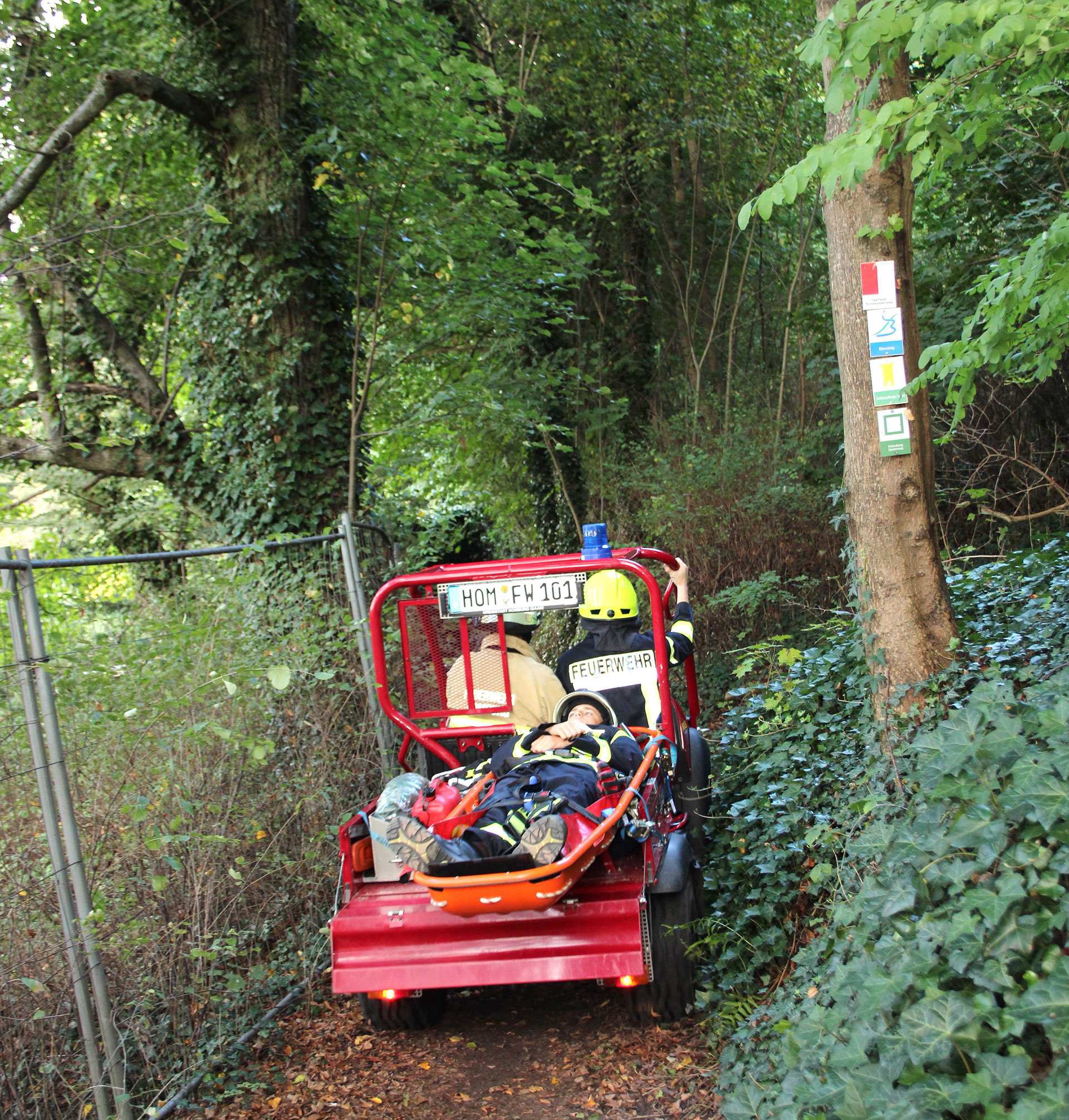 Im Eingangsbereich übernahm der Löschbezirk Homburg-Mitte unter Leitung des stellvertretenden Löschbezirksführers Ralf Wittmann. So wurde der Verletzte samt Trage auf der Ladefläche der Mule fixiert.