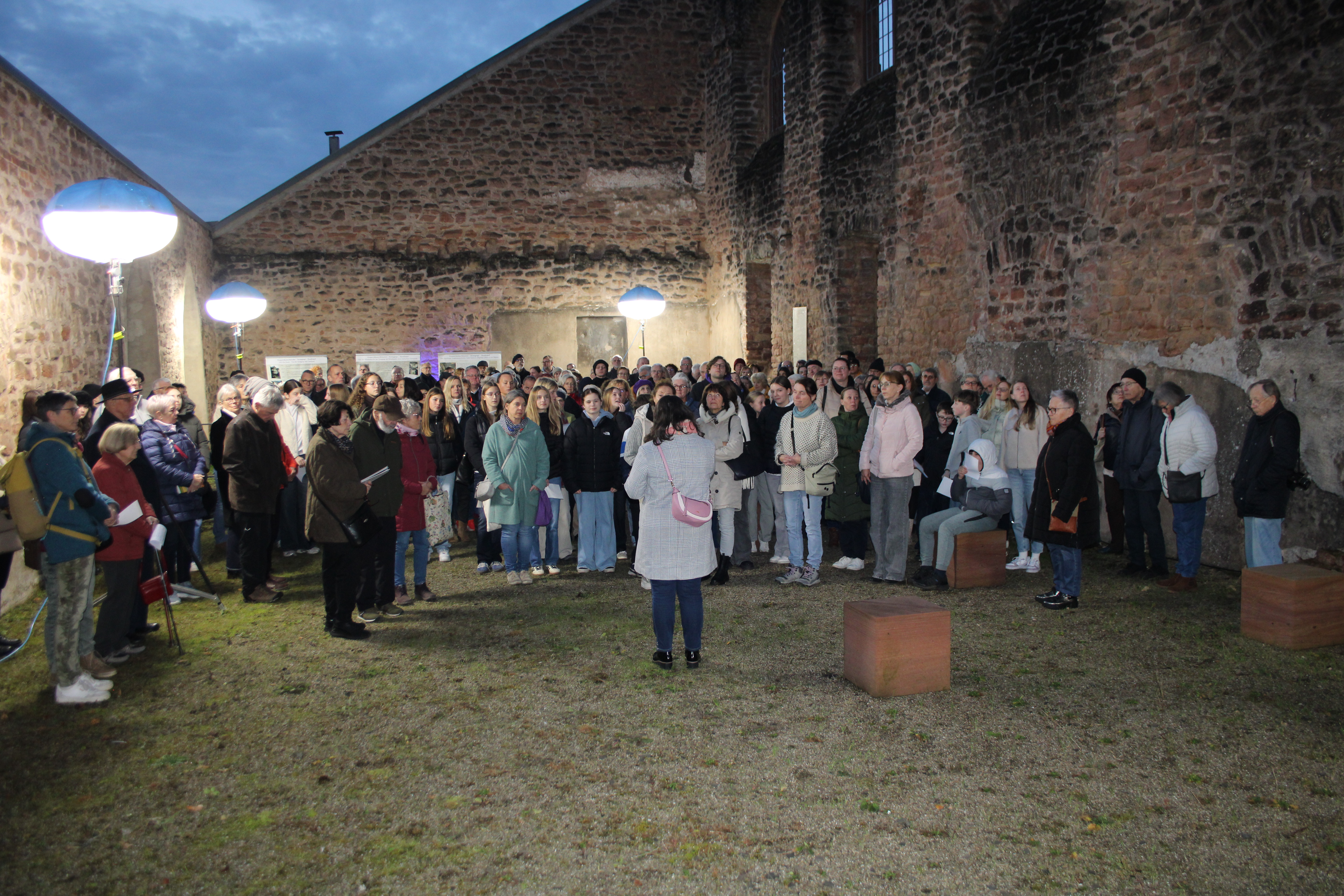 Zum Abschluss der Gedenkveranstaltung versammelten sich die Teilnehmerinnen und Teilnehmer in der Ruine der Synagoge.