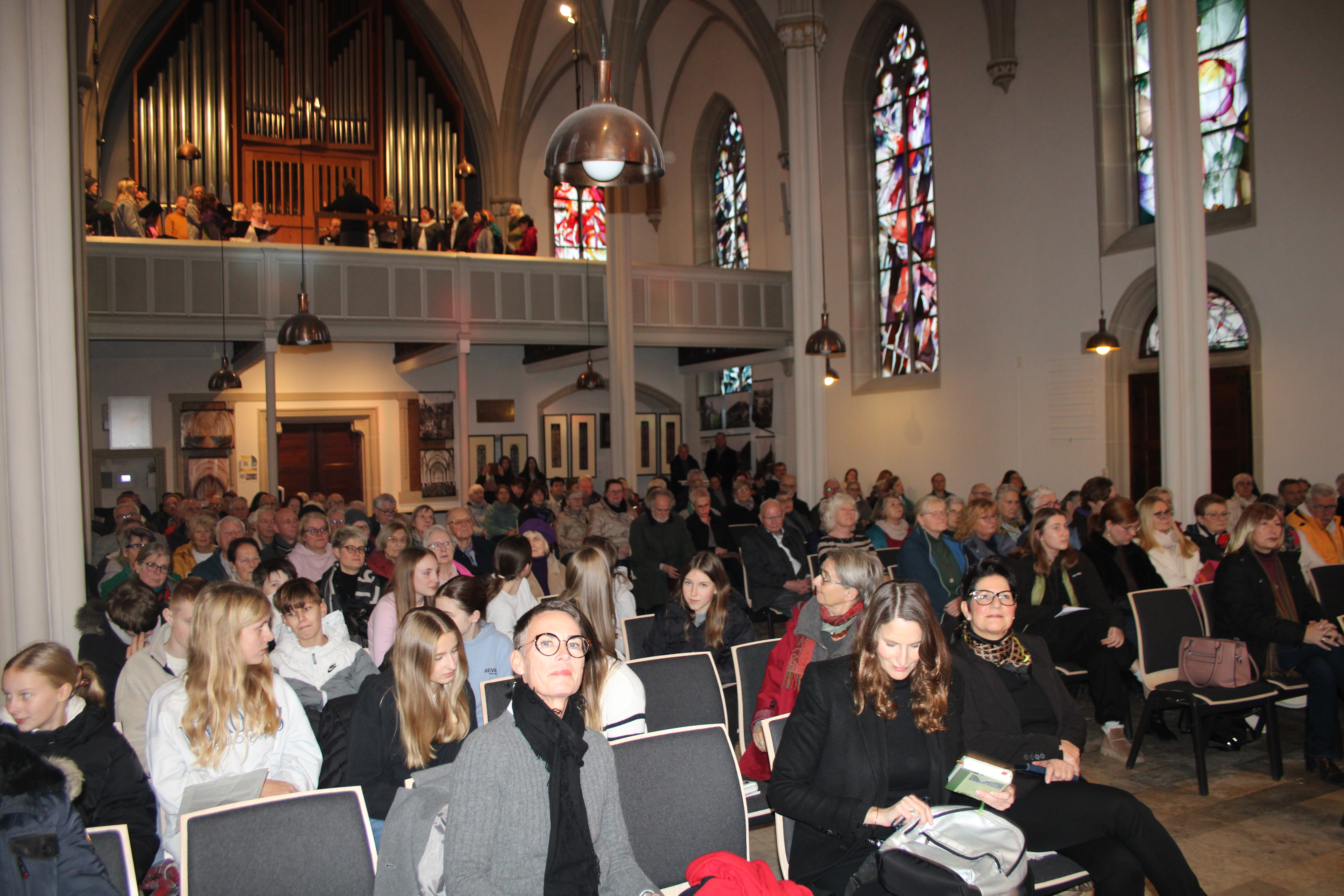 Das Gedenken zum 9. November in der Stadtkirche war sehr gut besucht. In der vorderen Reihe sitzen Pfarrerin Petra Scheidhauer, Joanna Bergin und Petra Simon (v. l. n. r.), oben auf der Empore ist der Chor der Musikschule zu sehen.
